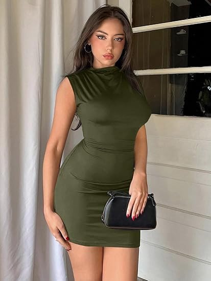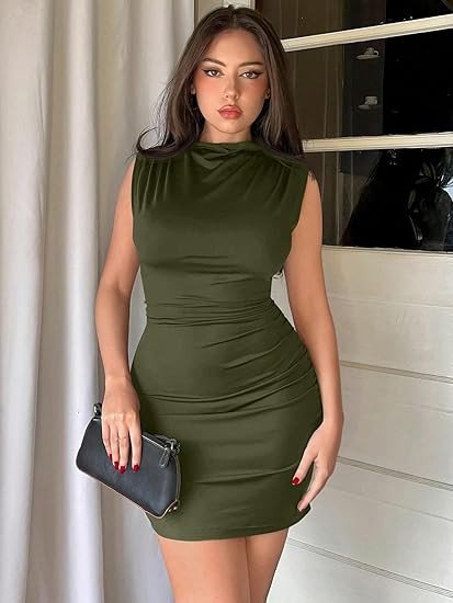 Classic Design:Side ruched, stand collar, sleeveless, pencil hem, bodycon.Slim fit design makes you look slimmer, it hugs you perfectly and shows off your female curve silhouette.